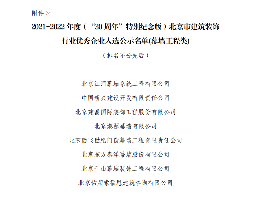 入选2021-2022年度(“30周年”特别纪念版)北京建筑装饰行业幕墙工程类优秀企业名单。